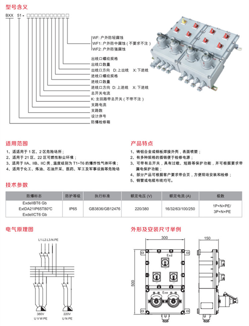 鋁制防爆檢修箱采用鋁合金材質壓鑄而成,表面高壓靜電噴塑,外形美觀,防爆檢修箱屬于防爆配電箱的一種,可作為動力、照明、檢修之用,防爆檢修箱表面開關手柄操作,根據(jù)客戶要求定制而成,防爆箱采用復合型結構,進出線端子箱,隔爆型防爆箱內裝高分段小型斷路器或者塑殼開關,漏電開關等,增安型防爆箱內裝接線端子,防爆插座等,不銹鋼緊固件,樂清益安防爆電器科技有限公司。
